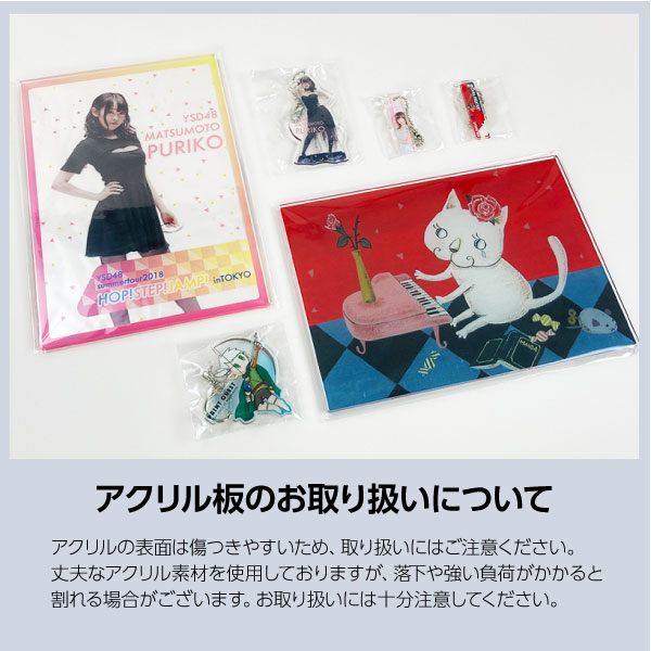 販売グッズ・俳優やアイドル、芸人、スポーツチーム、アニメなどのグッズに。絵師・クリエーターの人たちの個展などのグッズなど。表現力豊かな印刷技術で、写真やグラデーションも美しく仕上げます。